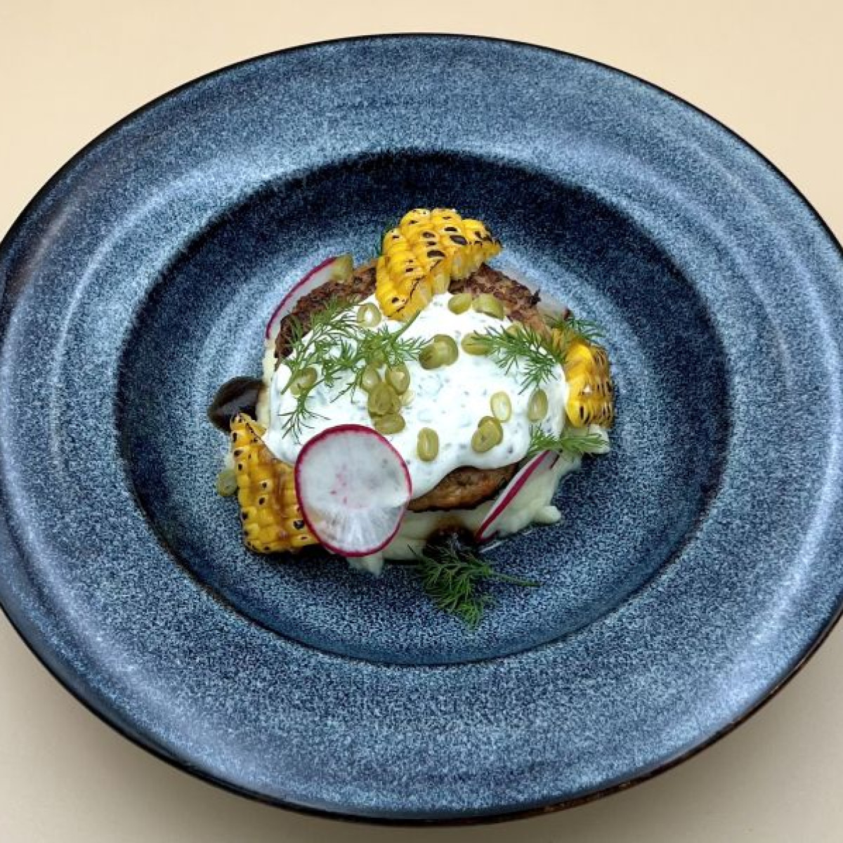 котлета из форели, картофельное пюре,  соус из йогурта, Кукуруза, Унаги, Укроп, Редис, Маринованная фасоль. Вес-360г.
